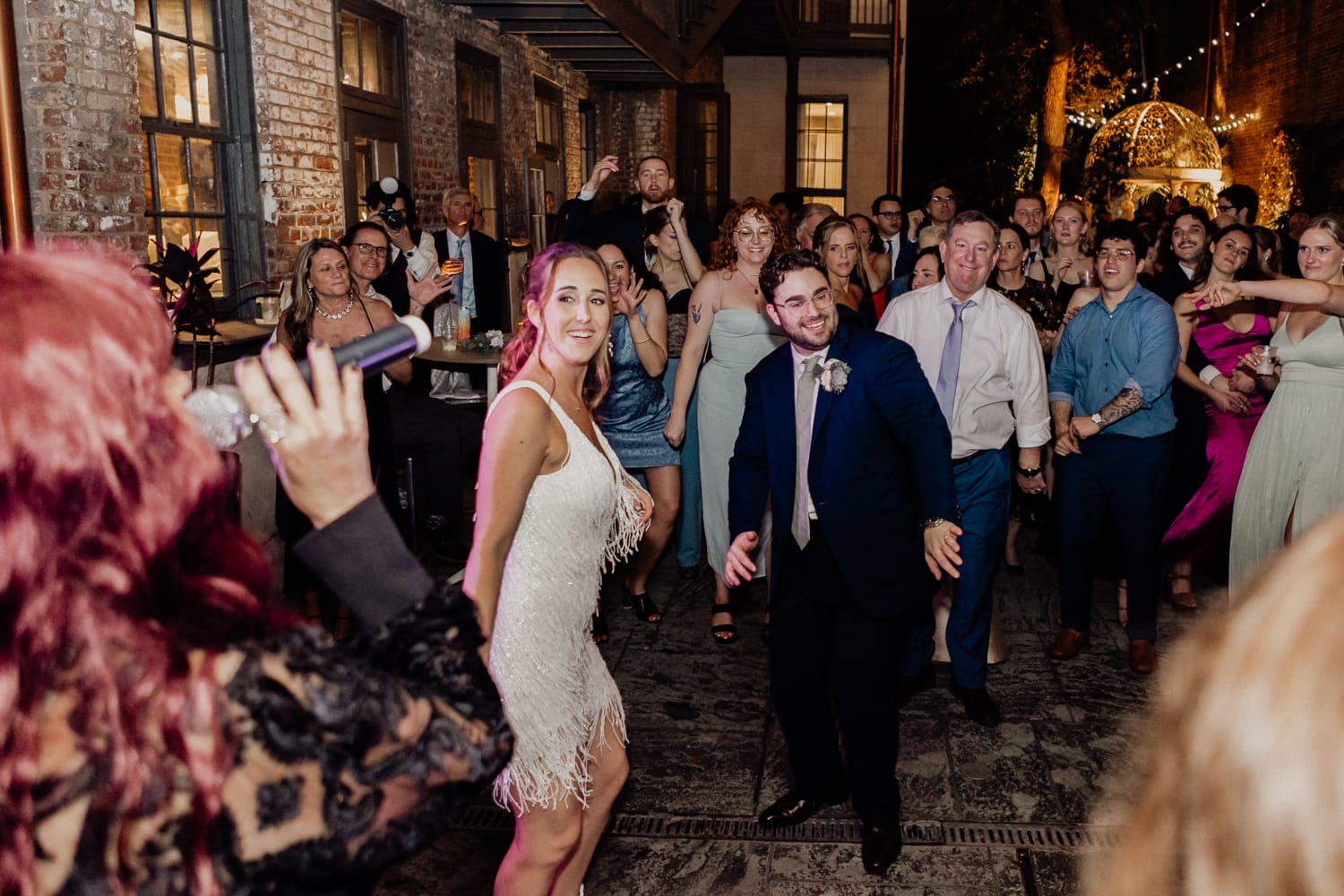 Following the ceremony, a second line parade led by Crescent City Soul energized the crowd, infusing the event with the city’s vibrant spirit. Guests joyfully danced their way through the streets before returning to the courtyard for a sit-down dinner catered by Elysian Catering, featuring thoughtfully prepared dishes that enhanced the evening’s sophistication. Cubs the Poet added a personal touch writing poetry for guests in the gazebo. The night concluded with dancing and merriment in the courtyard, where laughter and joy filled the air.