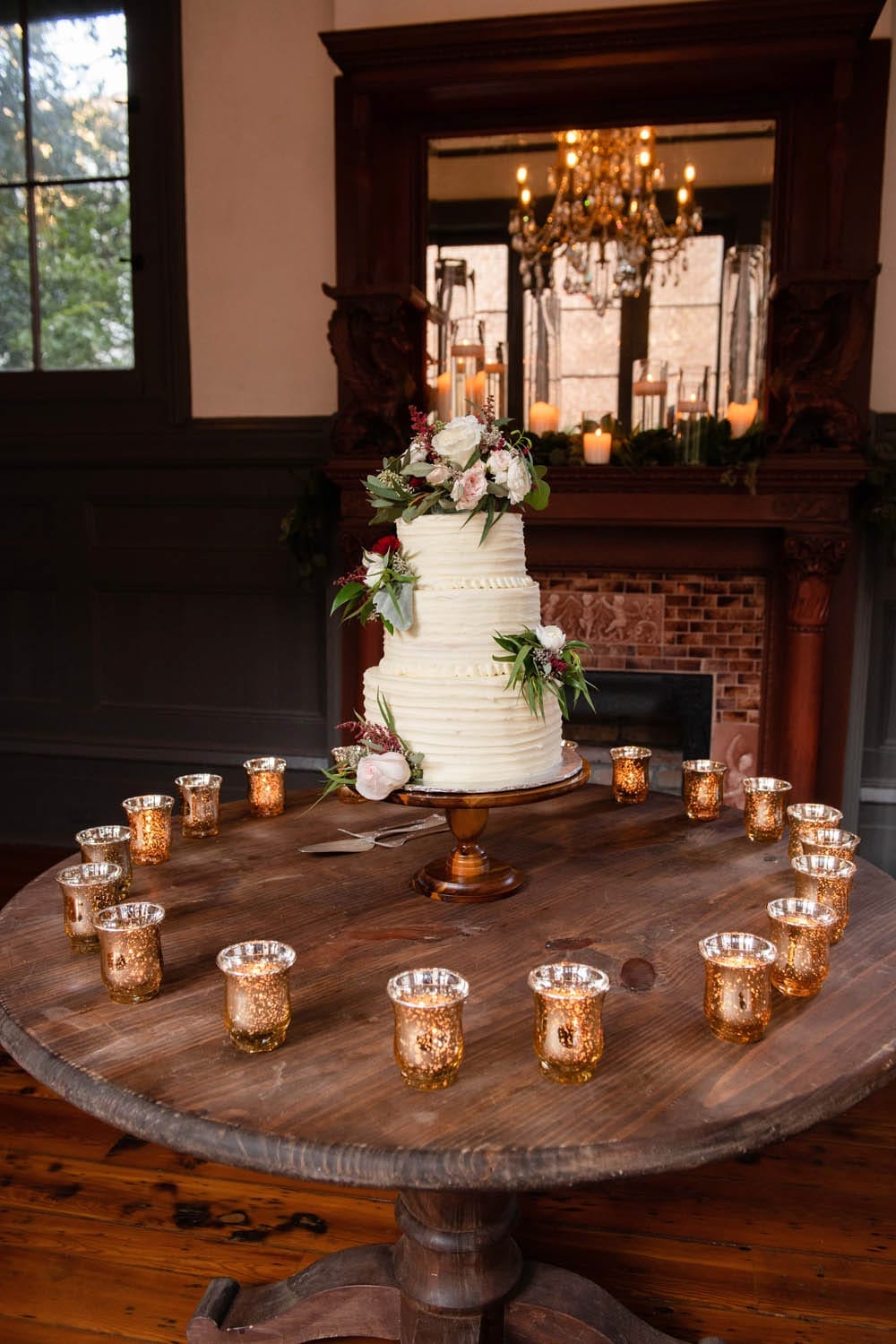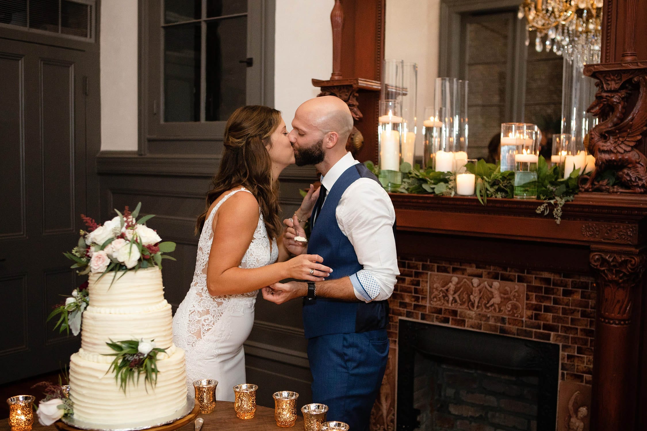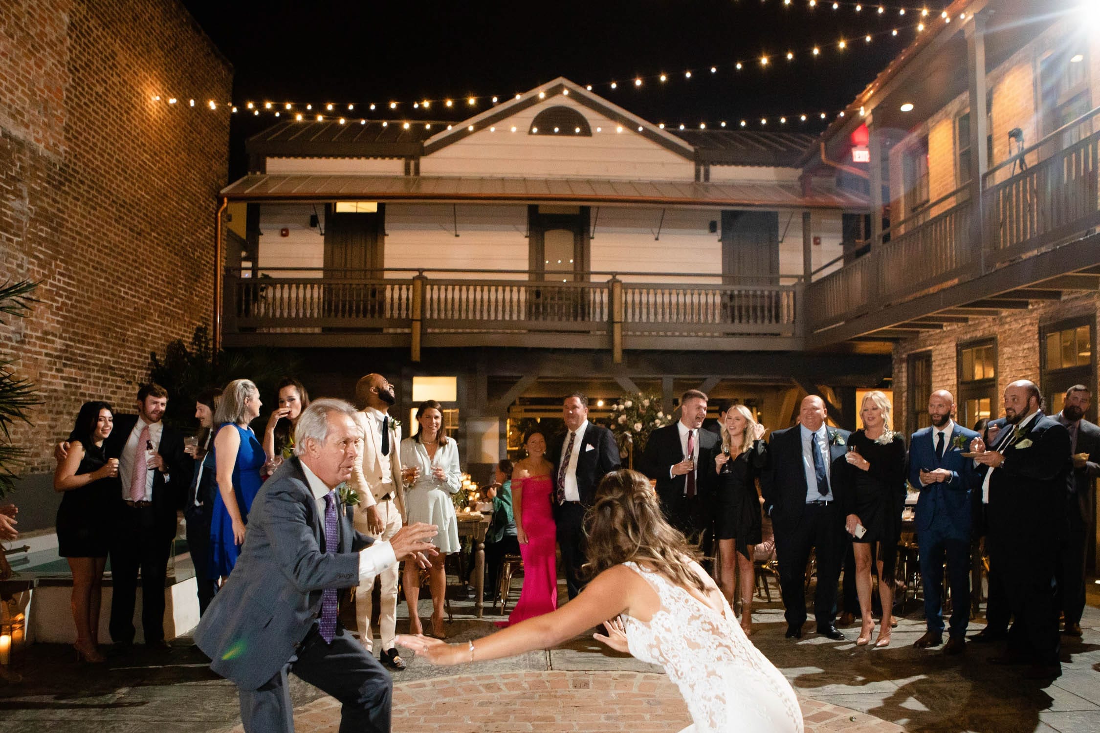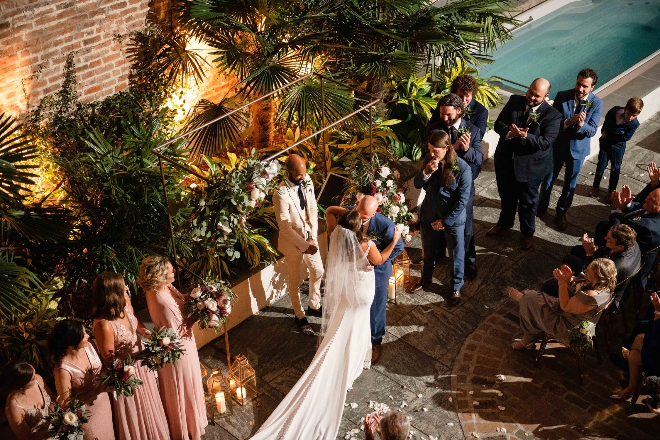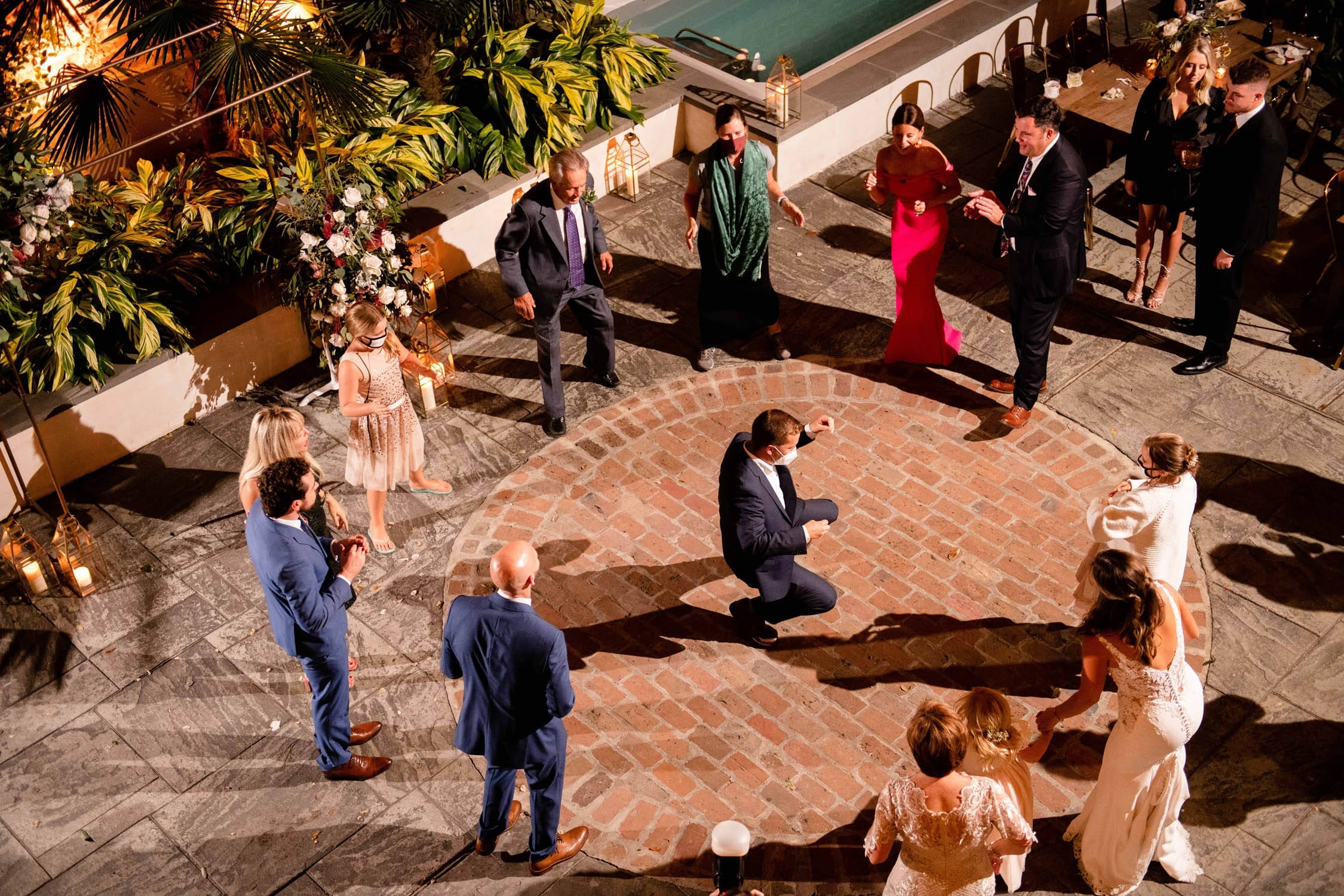 This wedding and reception during the pandemic did an exceptional job of filling the space with a small group. Having great friends and family surely contributed but so did some clever and unusual layout decisions. The ceremony was held in the center of the courtyard with a wide and shallow seating arrangement using the same chairs as the seated dinner that followed. They also chose to leave the pool open and decorate it with floating electric candles which moved in the current and contributed to a relaxing atmosphere. At least until, DJ Dr. Brice Miller, playing from the gazebo, got the small crowd completely hyped. Beautiful but restrained decorations by The Plant Gallery and excellent passed appetizers by Joel’s Catering complimented and completed this focused and flawless wedding.