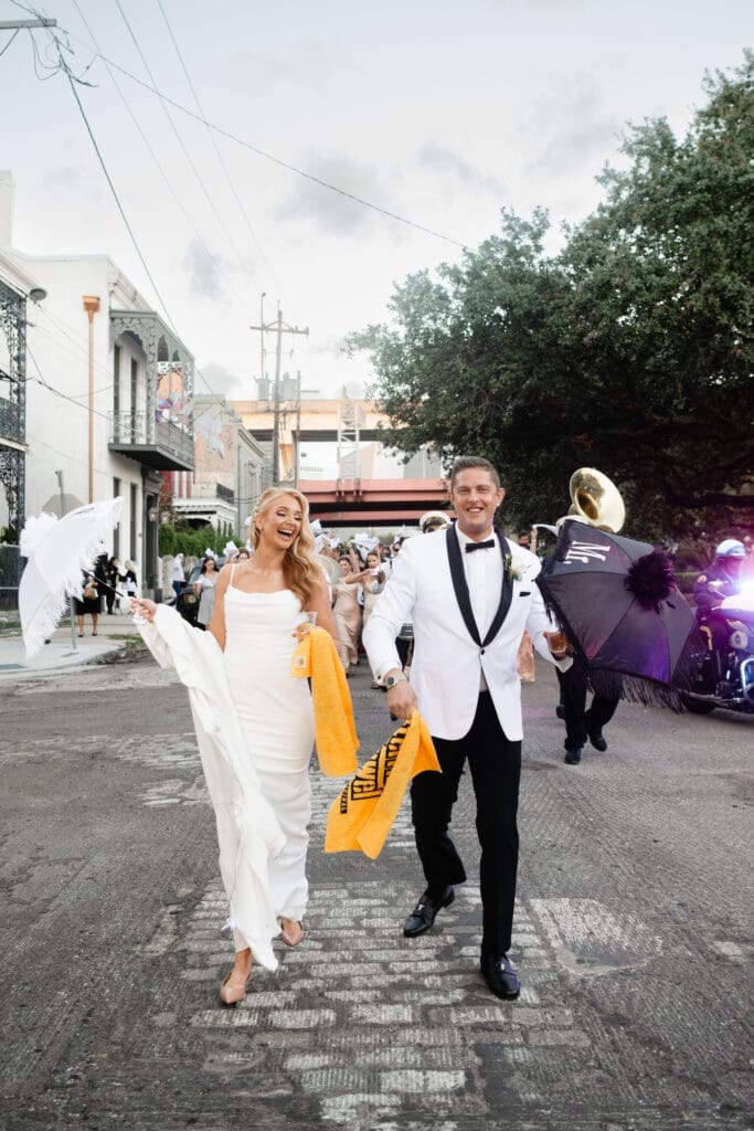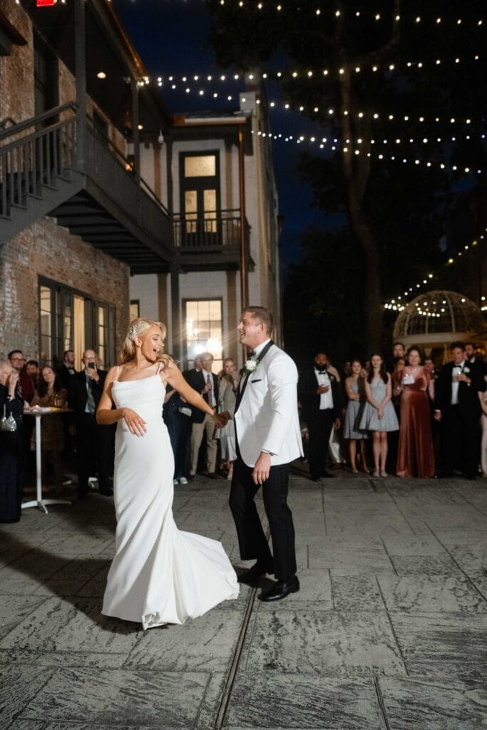 This destination wedding showed exactly what we do best: combine New Orleans heritage with world-class event capabilities. The ceremony took place on our historic courtyard stage, framed by The Plant Gallery’s florals. A second line followed, led by the BIG FUN Brass Band—a quintessential New Orleans celebration and a perfect way to shift seamlessly from ceremony to reception. Guests enjoyed a seated dinner from Clesi’s Restaurant, serving straightforward, high-quality Creole cuisine. As the night went on, Aexo Entertainment kept the energy high with a full dance floor. Flawless planning by InNOLA Events & Design made the night one to remember.