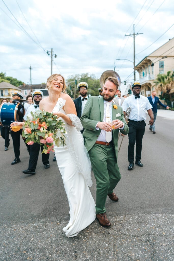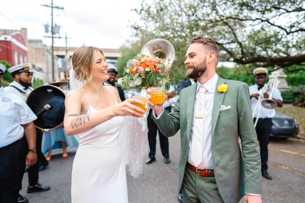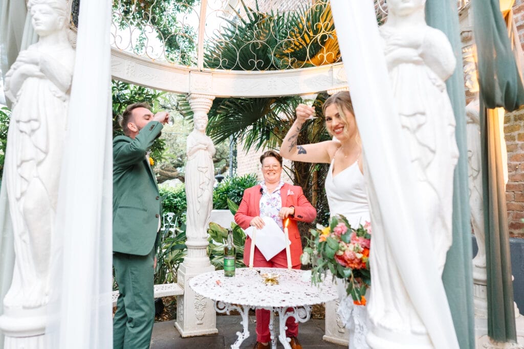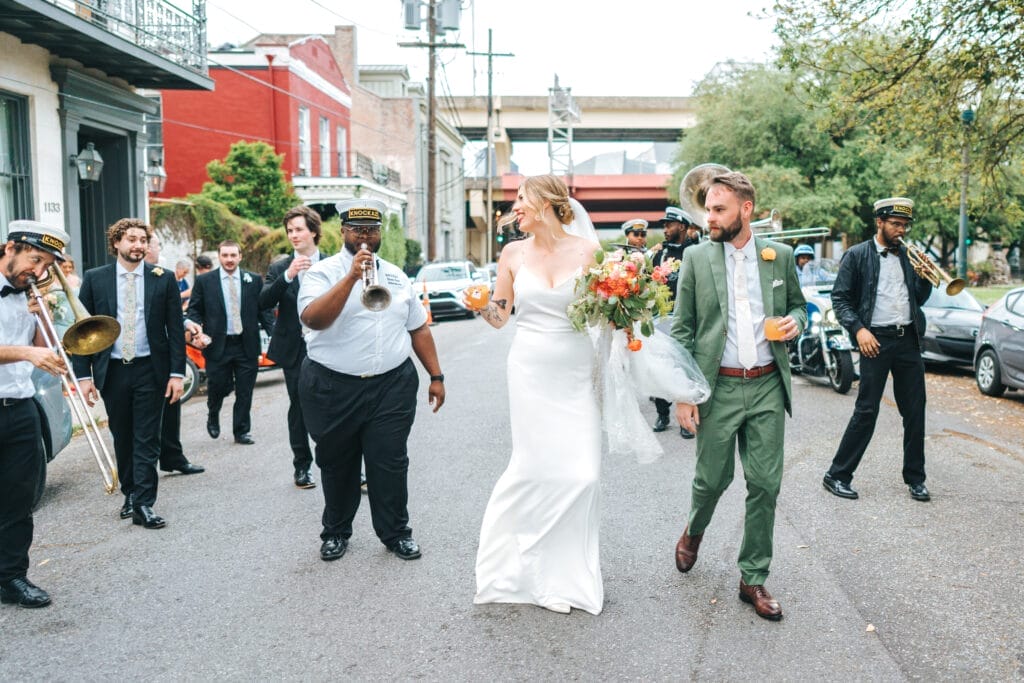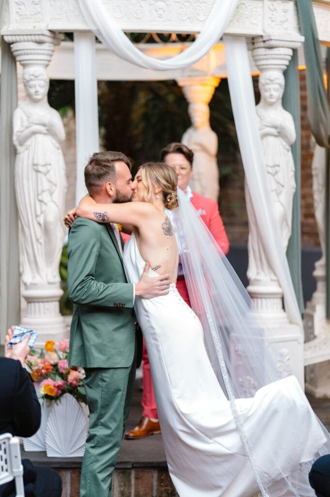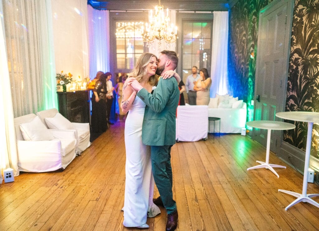 Autumn and Spencer’s April wedding was effortless, electric, and entirely their own. The courtyard ceremony beneath the gazebo set the tone—intimate yet bold—before Knockaz Brass Band took the lead, guiding the couple and their guests through the streets in a Second Line that pulsed with New Orleans energy. The party continued in the parlor, where DJ Pass the Jeffery and a masterfully designed lighting setup turned the space into something cinematic.