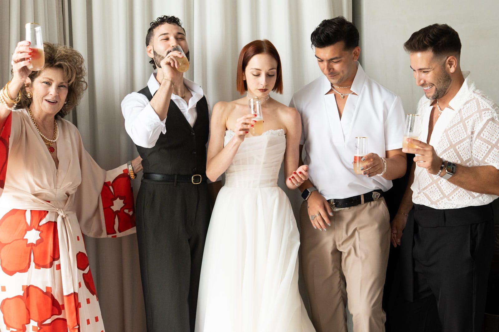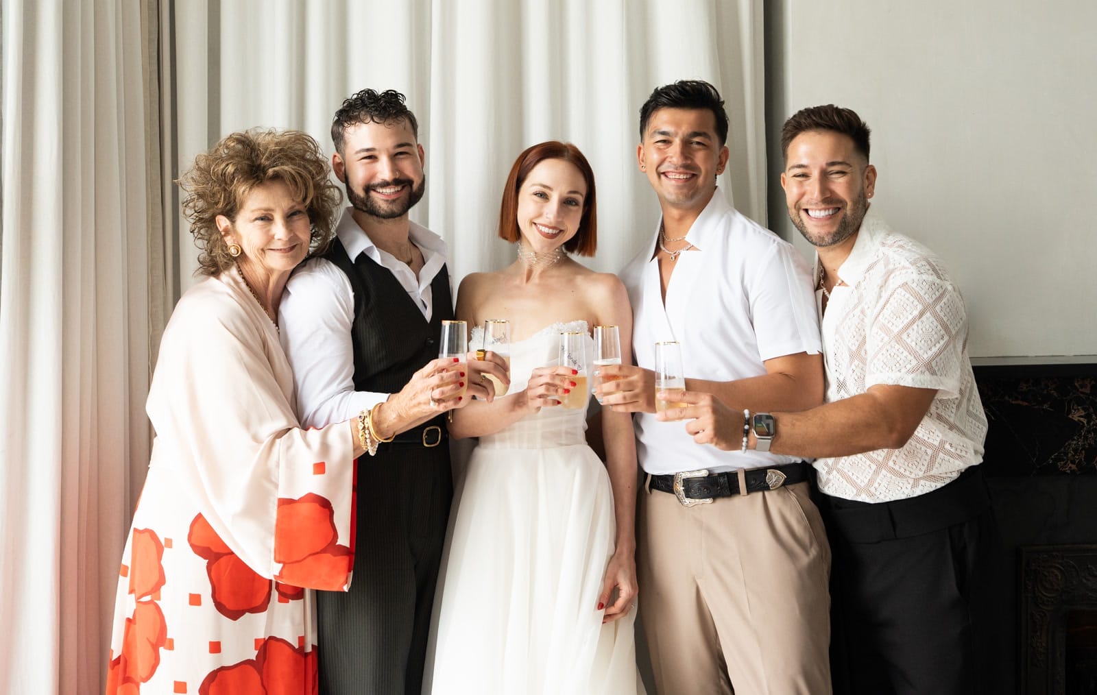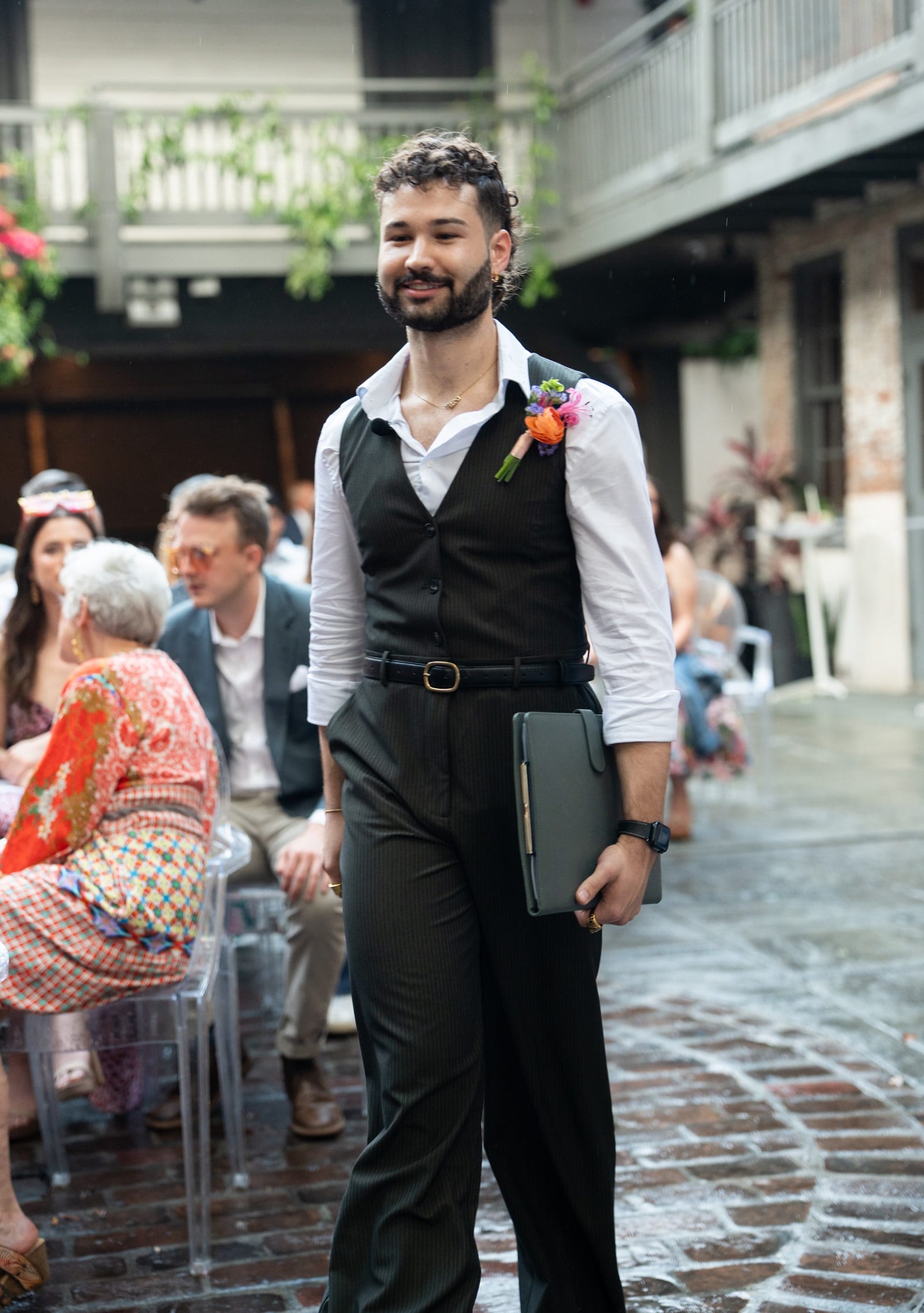 Hours before their 105 guests arrived, a summer storm rolled in — and it only made the evening more memorable. Sparkling wine was hand-passed in the Parlor while the team worked behind the scenes, pivoting the floor plan and clearing the courtyard. Coordinator Megan Sapp kept everything seamless, photographer Jen Wolfe captured every moment with an artist’s eye, and by the time the second line wound through the Lower Garden District, the rain had become part of the story. David later called it “the best day of our lives.”